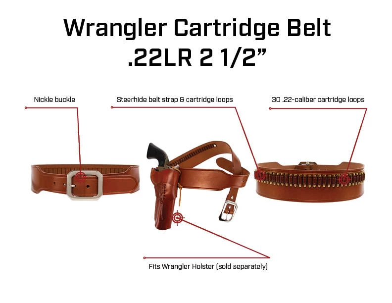 Our Wrangler Holster™ is a tan steerhide, high-riding design with open top and hammer thong retention. The matching leather cartridge belt carries spare rounds in loops. 2 ½” wide and tapering toward the brass buckle, it’s available in a wide range of sizes from 34” to 50” to fit most shooters.