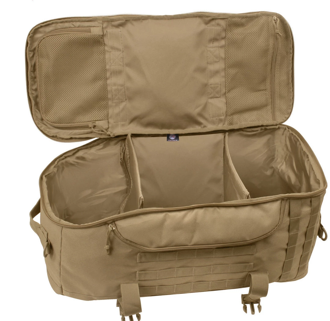 Rothco’s 3 in 1 Convertible Mission Bag is the ultimate go anywhere tactical bag. This military style MOLLE pack measures 26” x 13” x 11 and features a large main compartment with three sections with two zip-up dividers for easy storage of clothing and equipment. In addition, the interior of the pack features a top flap with a mesh zipper pockets for additional storage. The exterior of the convertible backpack features MOLLE (Modular Lightweight Load-carrying Equipment) Loops on the front, back and top of the bag, a top and side carry handles, detachable & adjustable shoulder strap, 2-cinch straps with quick release buckles, drain hole, 1 side exterior flap pocket, and a front and rear zippered pockets with mesh divider. The back of the tactical bag is padded for comfort and has a hideaway zippered compartment for the additional straps.