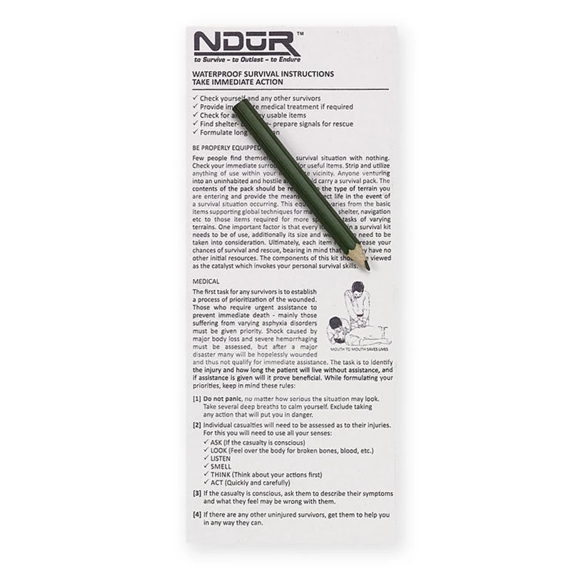 The NDūR® Survival Tin is an essential kit for every adventurer. Originally designed for the British SAS (Special Air Service). Many people confuse an emergency kit with a survival kit. A survival kit is designed to assist you in the short duration of time it takes for you to get help in the event you become disoriented and isolated in a non-urbanized environment. Your goal is to survive the elements until you get help. NDūR’s Survival Tin has everything you need in this situation.