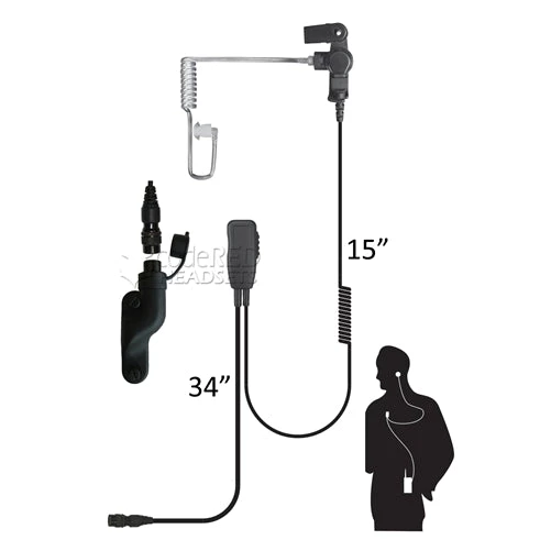 The Sherlock QD-Y5 is a single wire lapel microphone with a clear acoustic tube earpiece and a Y5 “Quick Release” adapter for Vertex radios.