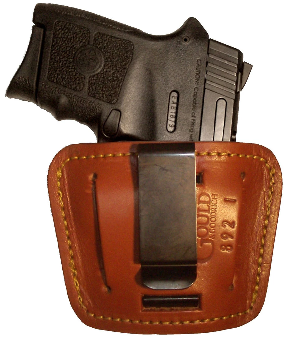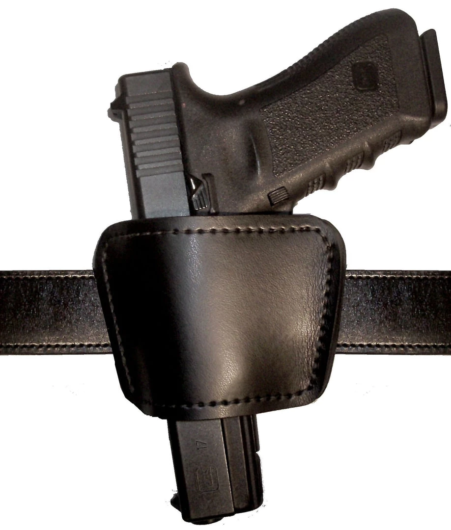 Spring steel clip is removable. Genuine leather. Suede lining helps protect gun finish.