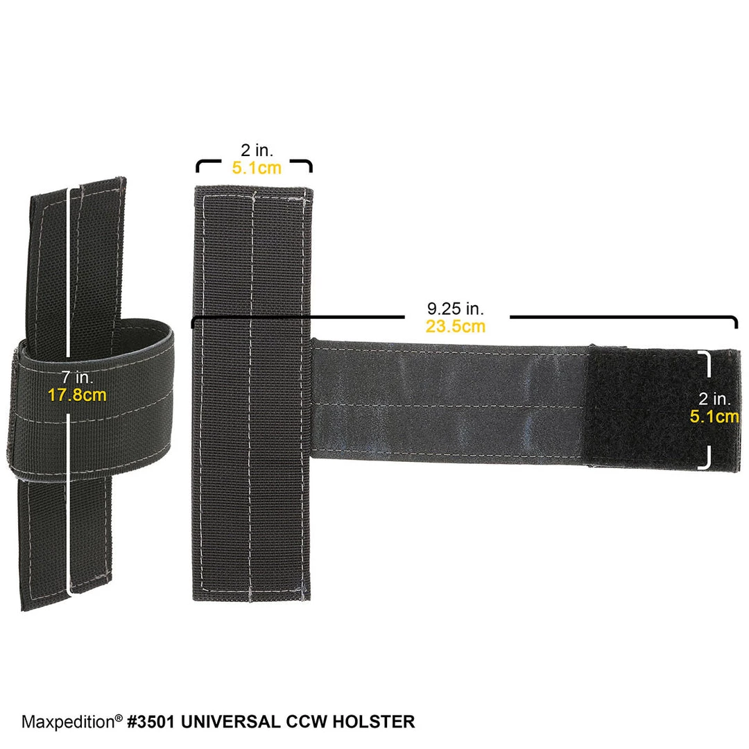 Ambidextrous CCW holster fits most handguns The Universal CCW Holster attaches with hook side velcro to loop velcro sewn in various Maxpedition packs. 2″ retention strap can be adjusted for a snug fit to your weapon. How To Use the #3501 Univ. CCW Holster: #3501 Univ. CCW Holster is equipped with “hook” fasteners. Compatible packs have compartments equipped with “pile”. First adjust the loop of the holster so it fits your firearm securely. To adhere the holster to the bag, simply press the “hook” side of the holster onto the “pile” field inside the pack. Position as desired to facilitate draw. If your #3501 Univ. CCW Holster is delivered with the loop flipped backwards, simply reverse it. We do this to prevent the hook from abrading other items while in the factory.