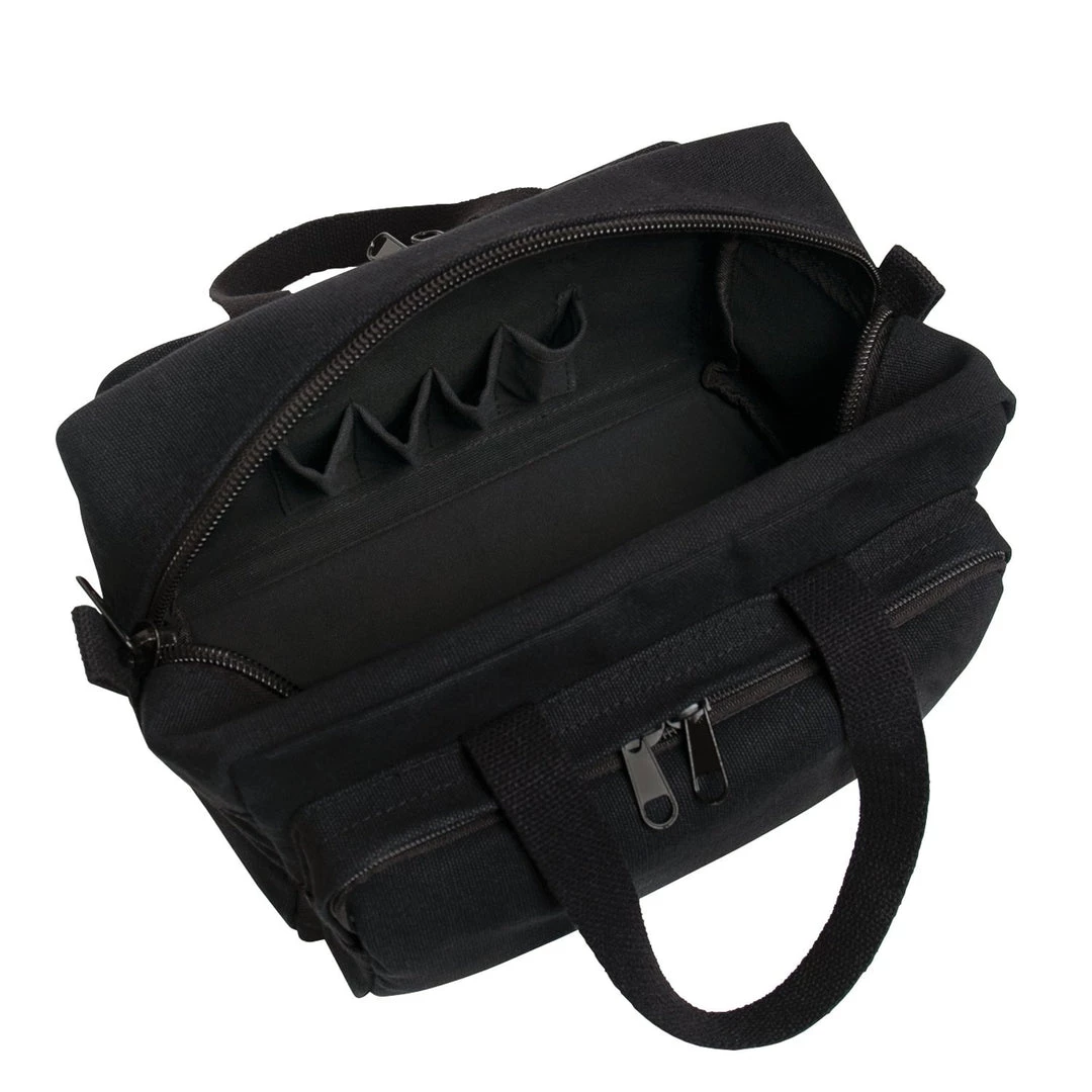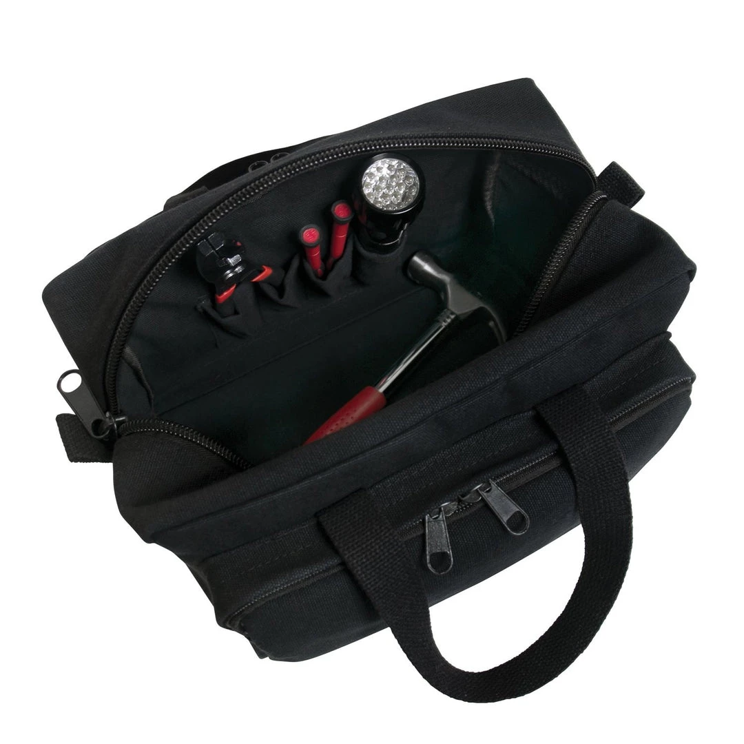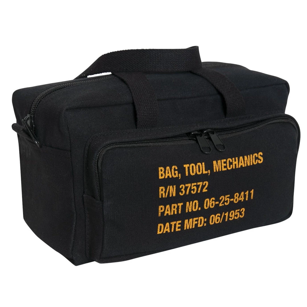 When it comes to transporting your tools, the right tool bag is essential. Rothco’s GI Type Zipper Pocket Mechanics Tool Bag provides storage and organization for your tools and other accessories. A large main compartment with tool organizers keeps everything neat without the hassle of searching for what you need. Front and rear zippered pockets keep smaller gear secure. The mechanics tool bag features a classic military-style stencil lettering on the front and is made from durable cotton canvas. Top carry handles allow you to take your tool bag from job to job with ease and the canvas bag measures 11″ x 7″ x 6″ overall.Â