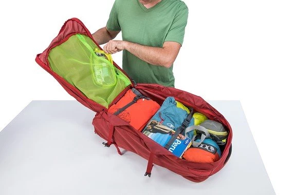 Unzip the lockable sliders to access the main compartment. Inside there’s a mesh pocket for small items. Dual compression straps keep cargo from shifting during transit.