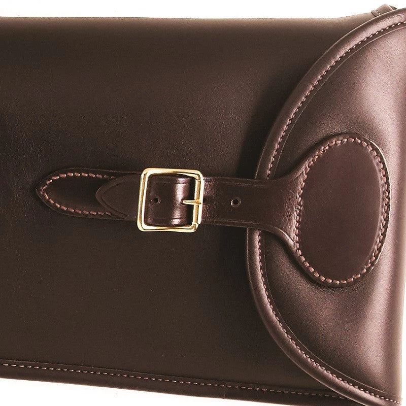 Our leather gun slip is constructed of dark havana leather. It features an interior core of closed cell foam laminated to our acrylic fleece lining. The muzzle is hand-stitched and the unique carry strap doubles as a spare sling. The hand-crafted universal nose cone fits both SxS and O/U shotgun designs.