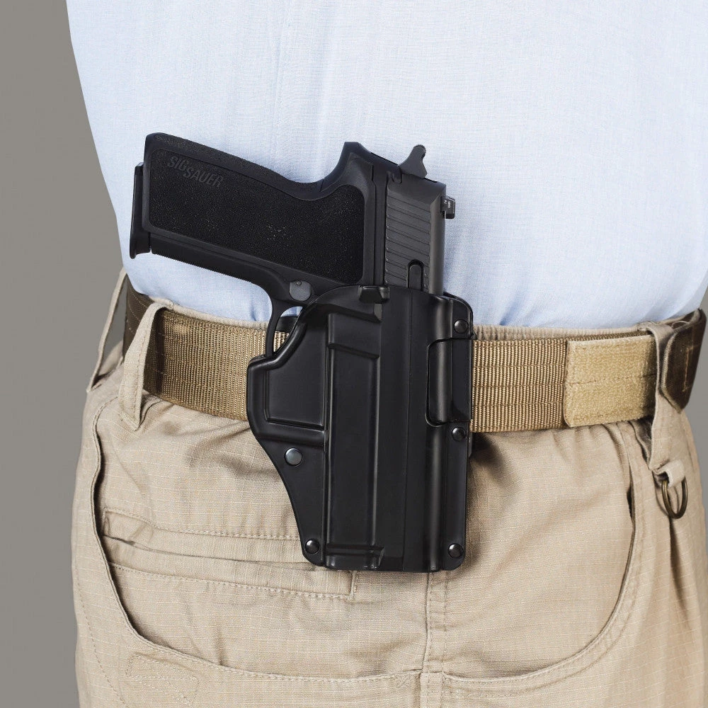 Offering a high level of security but an extremely fast draw, the M6X ALH is the latest addition to Galcos extremely popular Matrix holster line. Galcos patented* locking device retains the pistol until the ergonomic and intuitive thumb-release lever is depressed, instantly releasing the pistol for a quick, smooth draw. Constructed from the same injection-molded thermoplastic as the other Matrix holsters, the M6X also maintains the same fierce durability and dependability. The locking mechanism has endured torture tests involving thousands upon thousands of draws, and is well-suited to hard real-world use. Using an adjustable belt slot attachment method, the M6X fits belts from 1 1/4? to 2? in width. The neutral cant allows a fast and comfortable draw, while the belt slot design pulls the pistol in tight for good concealment.
