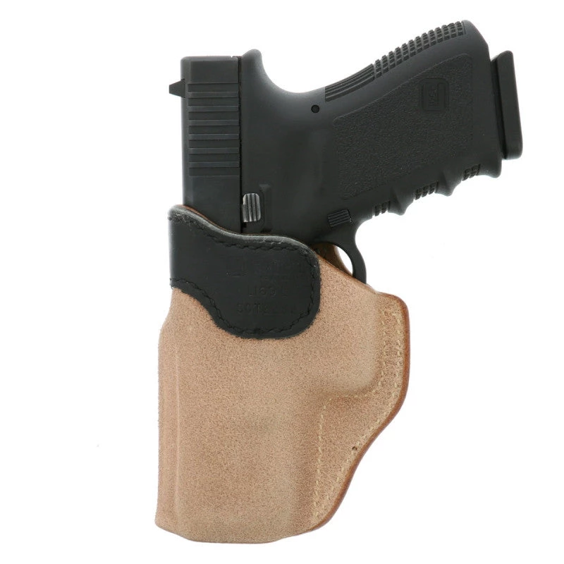 The Scout is constructed with the rough side of the leather out. This construction method provides additional stability in the waistband, as well as a smooth leather holster pocket for a faster, slicker feel on the draw.