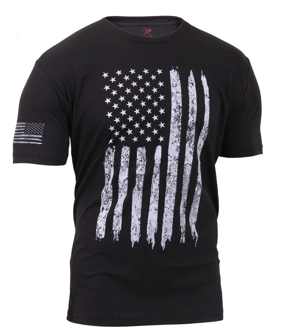 Rothco’s Athletic Fit T-Shirt features an updated fit with an insert collar, wider chest and smaller sleeves for a more athletic fit. The distressed US Flag T-Shirt displays a white vertical US Flag graphic and a reversed flag on the right sleeve. Â The US Flag shirt is tagless and made from a soft and durable poly/cotton blend. Rothco’s Athletic T-shirt is a lightweight cotton/poly blend with a tagless label for added comfort.