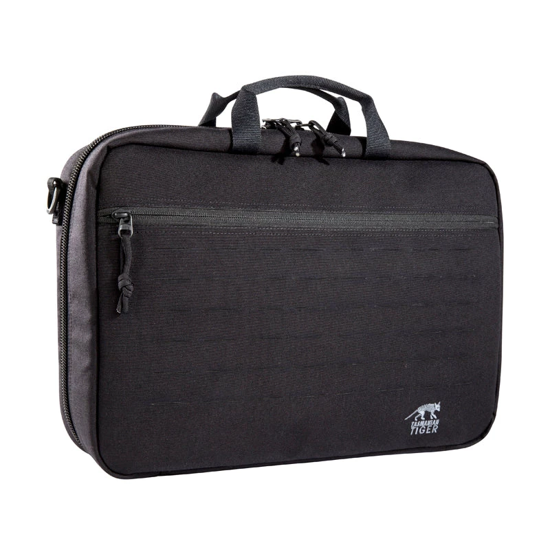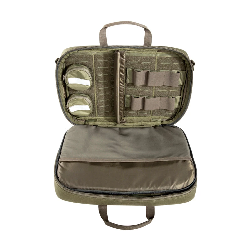 Modular handgun case for two or three weapons. The interior is fully equipped with MOLLE and hook-and-loop storage options. A zippered interior pocket is used for storing a laptop or additional equipment.