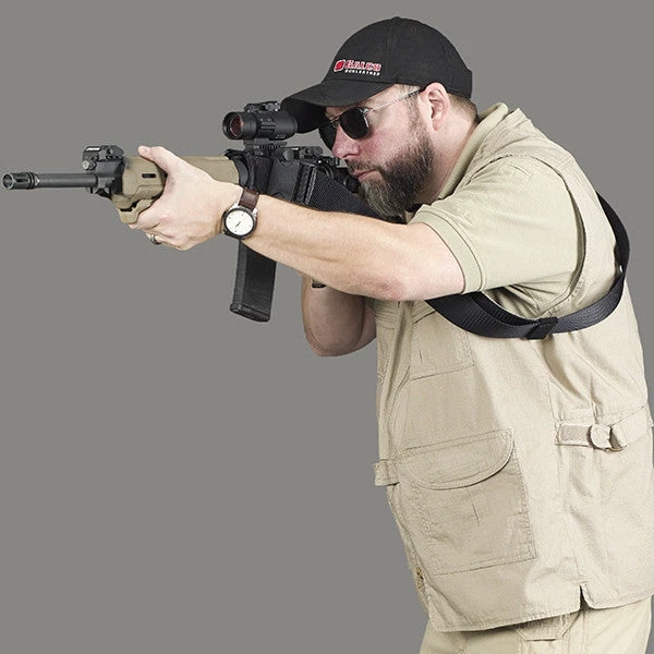 The BATTL 2 Slings 2? wide shoulder allows comfortable all-day carry of even a heavyweapon while still maintaining a posture of complete readiness. The adjustable shoulder strap fits over body armor, chest pouches, hydration systems, and other mission-essential equipment. The carbine versions positioning of the front strap attachment (at the delta ring) offers excellent balance, safe muzzle orientation and easy traversing capability. The BATTL 2 Sling also offers a quick and easy transition between strong-side and weak-side firing positions.