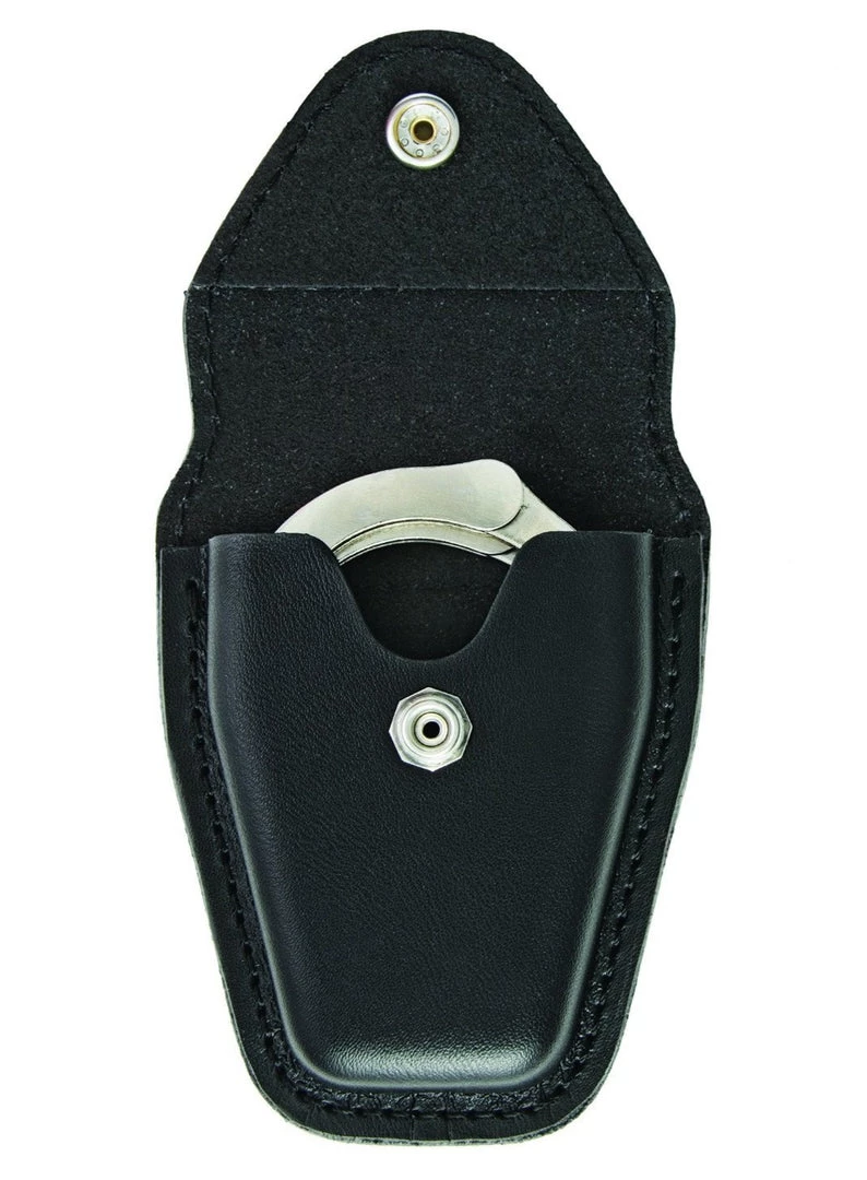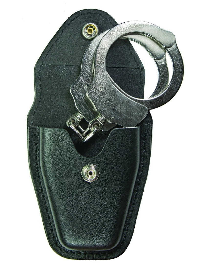 AirTek Single Closed Handcuff Case securely fits standard chain handcuffs and is crafted with our specialized 33E HP finish and 100% genuine leather to provide lightweight comfort, scratch resistance and durability. Molded design for secure equipment placement and quick in/out access. Reinforced DOT® snaps for reliable snap/re-snap functionality.