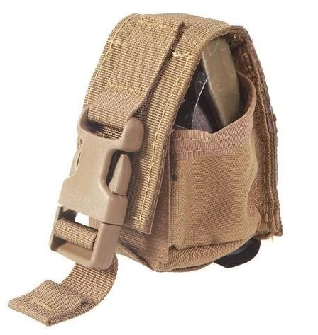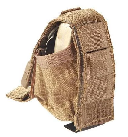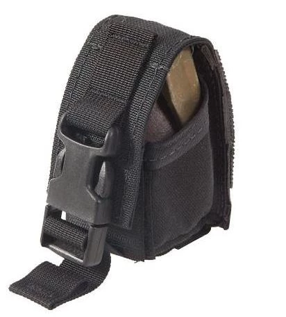 The Modular Frag Grenade Pouch carries a single fragmentation (M67) grenade. The flap uses a side release buckle and/or hook and loop to secure. A silencing strip is sewn in for the hook and loop to provide silent operation of the flap if needed. Designed with a spoon strap to prevent rotation.