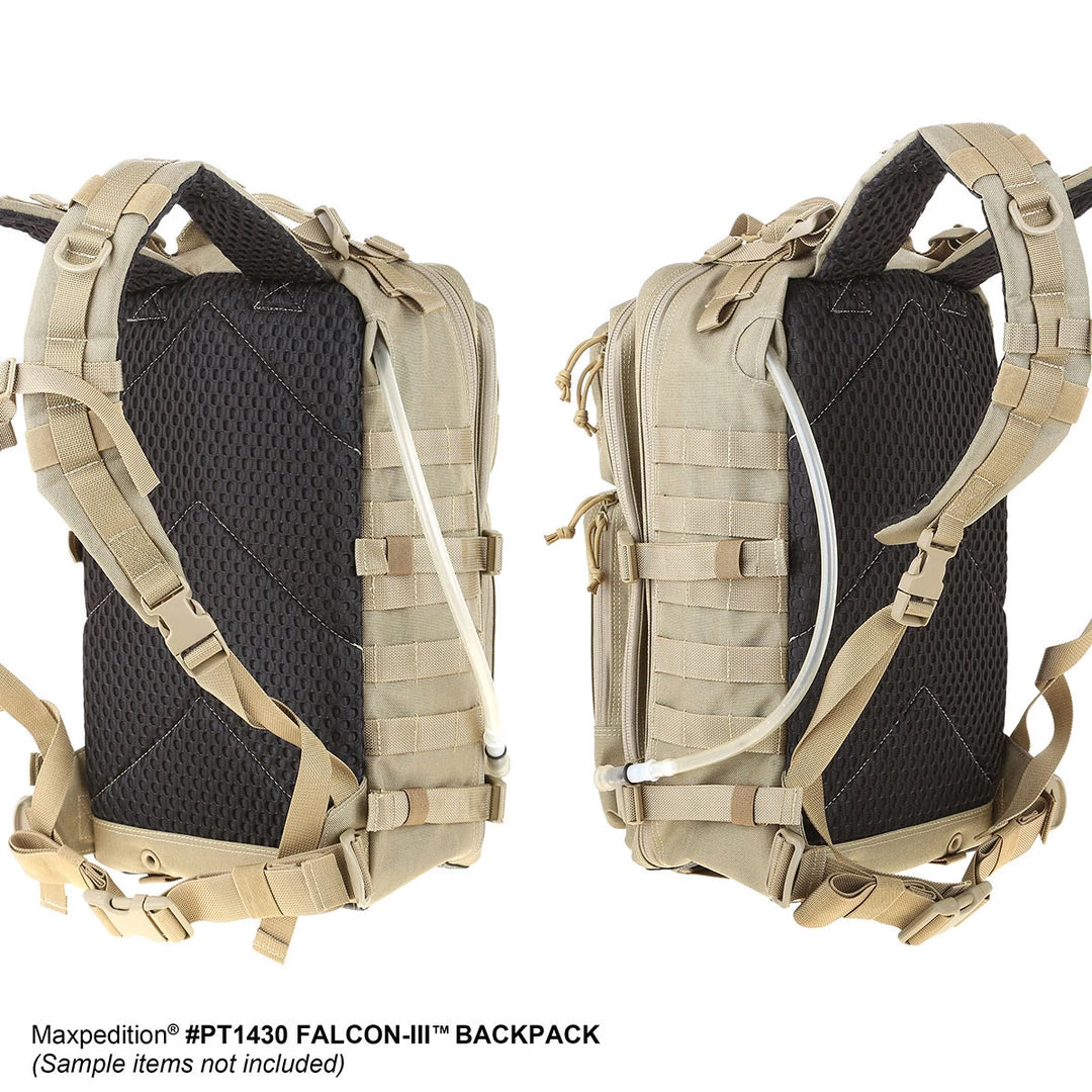 Enlarged and improved Falcon backpack with CCW compatibility.  Maxpedition backpacks are built for hauling gear and ergonomically designed to never drag you down. Curvaceous, foam-padded double shoulder straps contour to your chest and a sternum suspension belt helps distribute weight evenly throughout your upper body, so you can carry a load without falling behind.
