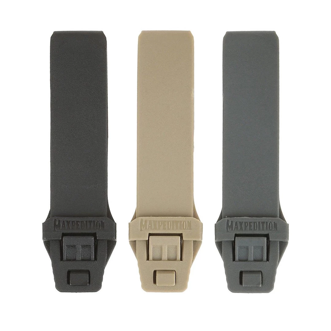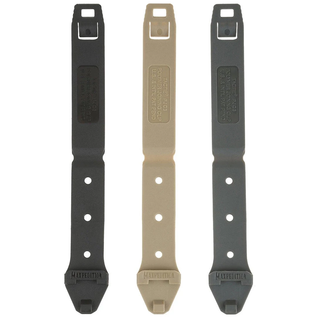 The TacTie Polymer Joining Clip (PJC) is a heavy duty injection molded hardware component developed by the Maxpedition design team, and it comes in 2 sizes: PJC3 and PJC5. It is used to integrate accessory pockets and pouches onto packs, vests, ATLAS surfaces, PALS surfaces and MOLLE equipment in an interlocking manner. The TacTie PJC is secure when properly woven but may be disengaged by hand without the aid of tools. They are backwards compatible with older Maxpedition pouches backed with webbing as well as fully MOLLE / PALS compatible.