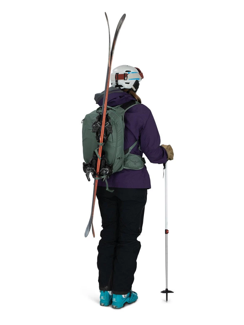 - Avalanche safety kit storage with shovel handle and probe sleeves