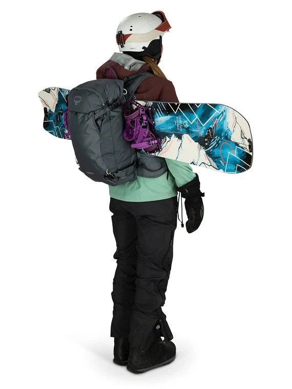- Vertical front panel and horizontal snowboard carry