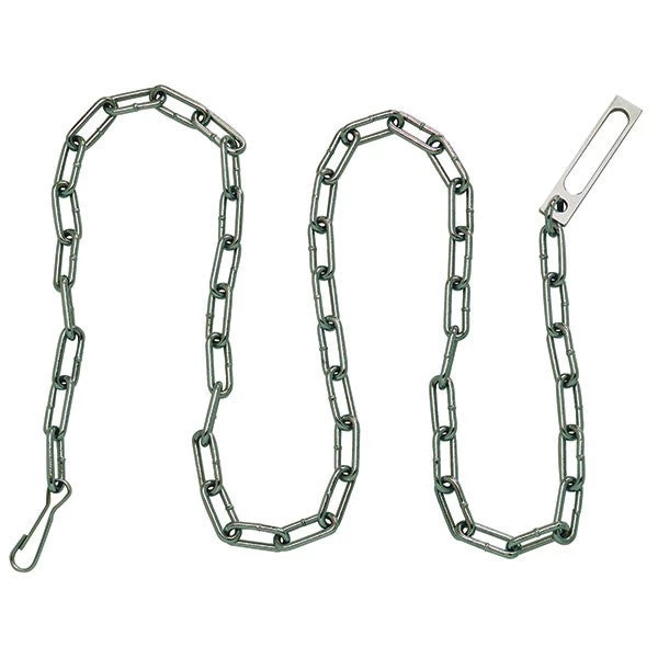 Chains designed for use in corrections, transport and courtroom situations. When used in conjunction with a set of handcuffs and a padlock this simple chain converts into a secure waist chain restraint. The special end link is compatible all commonly used handcuffs and will fit Black or Blue style security boxes. Nickel plated finish.