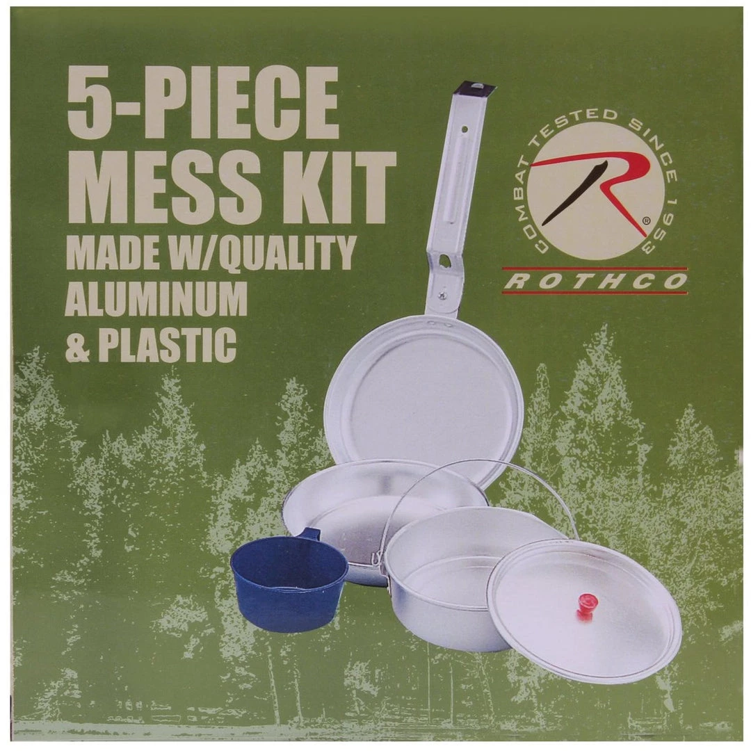 Rothco’s 5 Piece Aluminum Mess Kit is perfect for camping or surviving the outdoors. The kit contains a frying pan with handle, sauce pan, lid, plate and plastic cup.Â