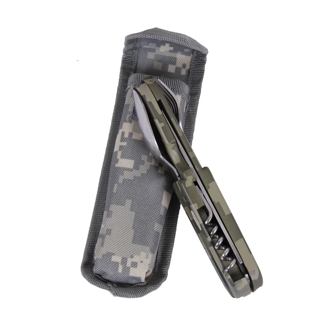 Includes Fork, Spoon, Knife, Cork Screw And Can Opener , Spoon Handle Has Flathead Screw Driver And Hex Wrench , Army Digital Camo Carry Pouch With MOLLE Attachment Strap