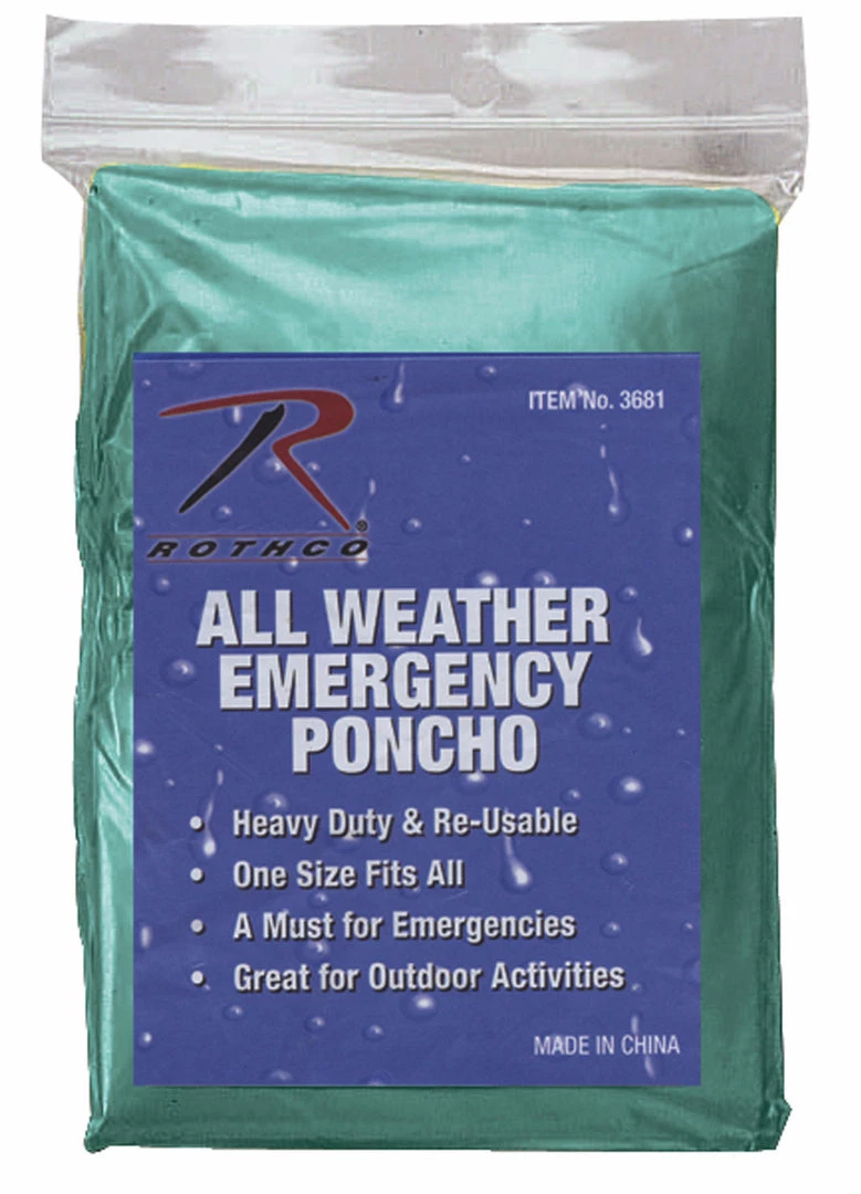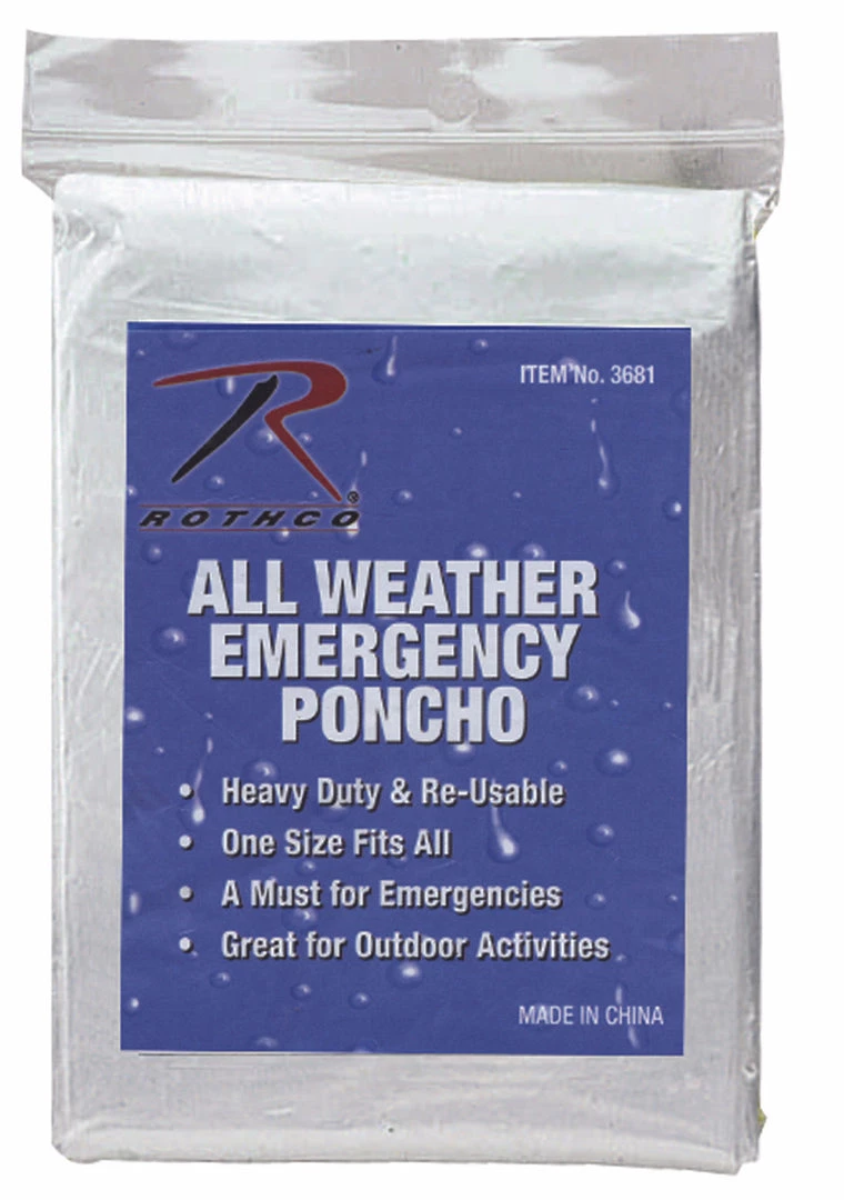 Rothco’s All Weather Emergency Rain Poncho is lightweight yet durable, reusable and easy to pack which makes it ideal for carrying in case of an emergency or for outdoor activities. Also a perfect addition to your bug out bag or camping pack. This is a one size fits all rain poncho measures 50″ x 80″ and features a hood to protect you from the elements.