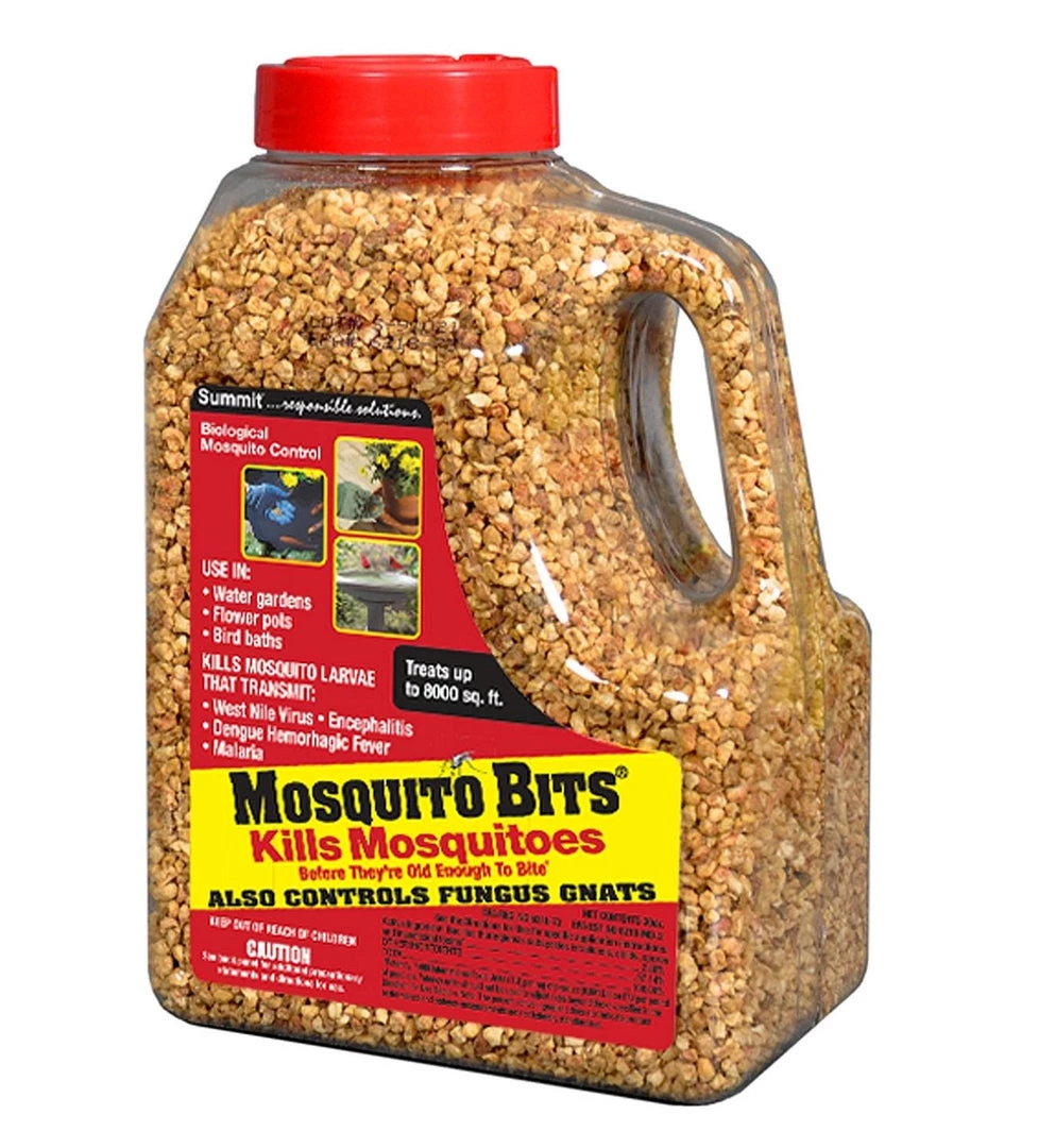 Mosquito Bits are designed to provide a ‘quick kill’ of large populations of mosquito larvae. They are safe, nontoxic way to control mosquitoes before they become flying, biting, disease-carrying adults. Bits release a biological mosquito larvicide at the water’s surface & as they settle it is eaten by mosquito larvae and they die within 24 hours. Can be used on all types of containerized standing water sites where mosquito larvae grow, except finished & treated drinking water. Mosquito Bits will kill the larvae of ALL SPECIES of mosquitos… that’s about 2,500 species for up to 14 days.