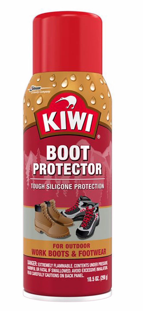Kiwi Aerosol Boot Protector sprays tough silicone protection for work and outdoor boots. Its unique silicone formula bonds to leather and other man-made shoe and boot materials to create an extremely tough water barrier. The spray is odorless when thoroughly dried and cured. The bottle is 12 ounces.