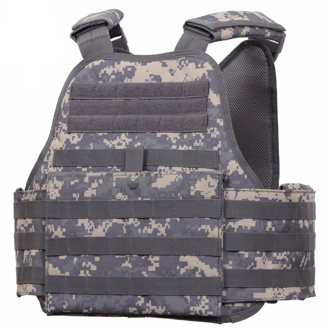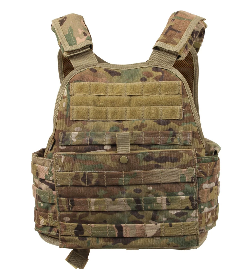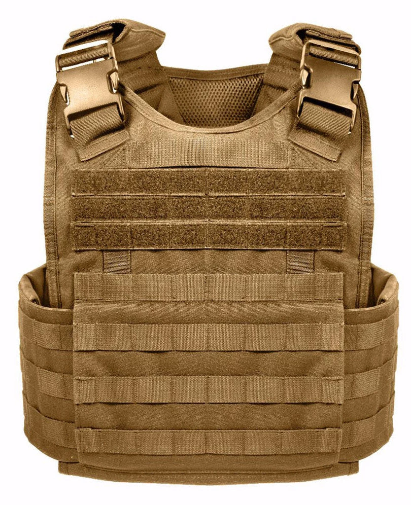 Rothco’s Molle Plate Carrier Vest is constructed with Heavy Weight 600 Denier Polyester and features Molle webbing that covers most of the vest and is ideal for attaching modular pouches and accessories. The vest has 13.75″ x 10.25″ x 1″ front and back internal sleeves for soft armor and plates and the vest includes an adjustable / detachable cummerbund with pockets for side panel plates (plate & soft armor not included). In addition, the vest features adjustable shoulder straps with detachable pads, emergency drag handle, padded mesh interior and quick release side buckles for easy removal. The Plate Carrier Vest comes in Black, Coyote, Olive Drab and one size fits most.