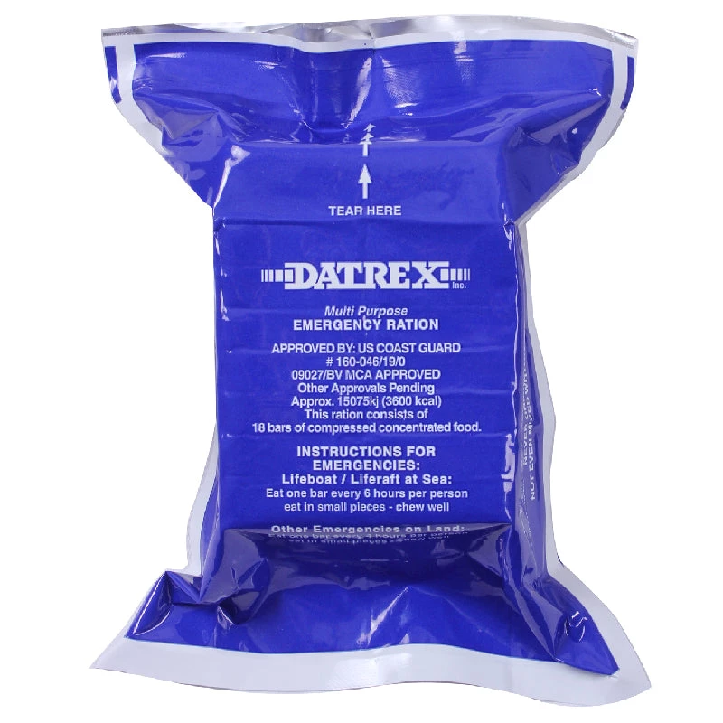 The Datrex Blue 3600 Calorie Emergency Food Ration is 18 coconut flavored bars, 200 calories per bar, 5 year shelf life, US coast guard approved. Good for survival or camping.