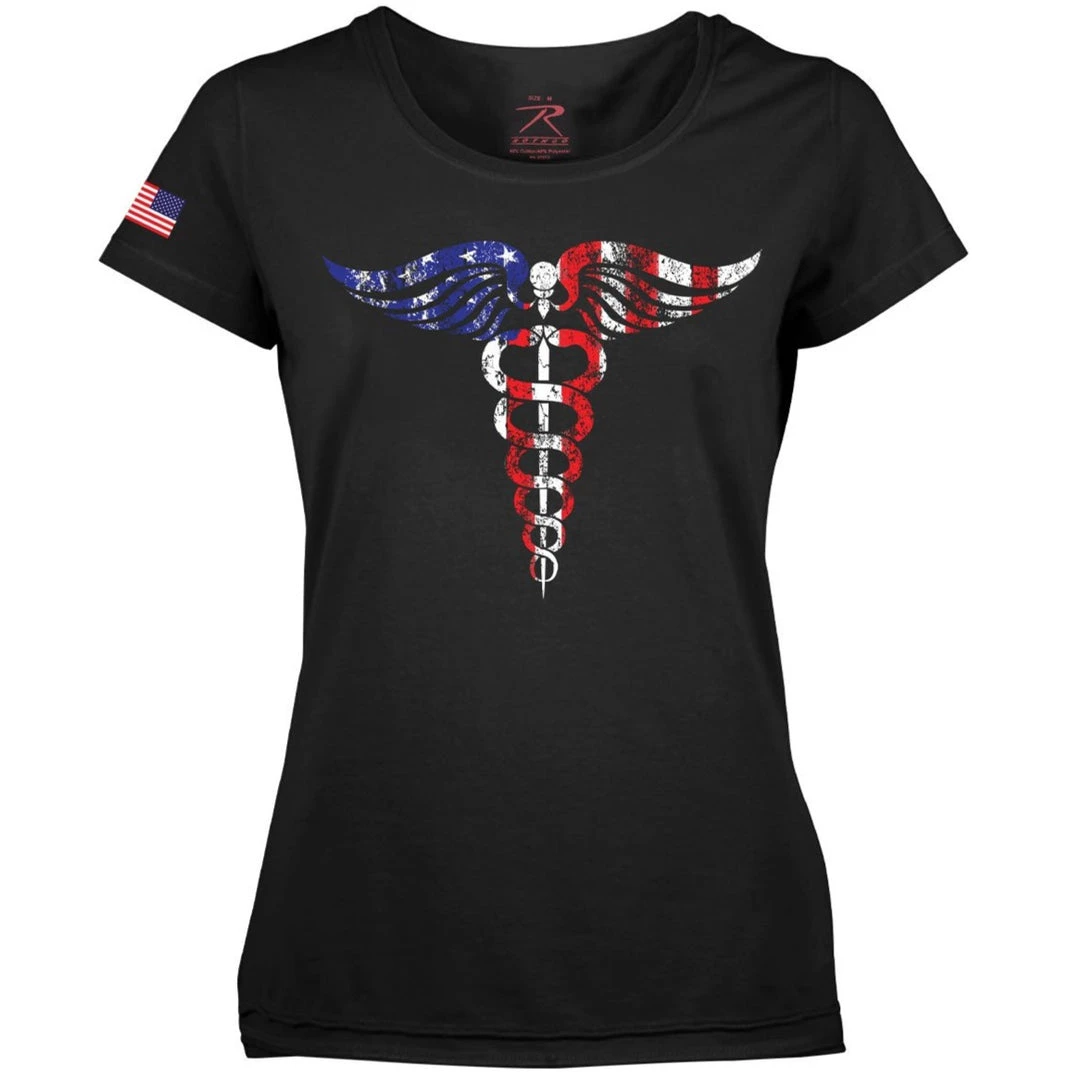 Featuring a distressed red, white, and blue flag Caduceus symbol, Rothco’s Medical Symbol Long Length T-Shirt for women honors the essential lifesaving warriors of America’s Healthcare System. The women’s healthcare shirt includes the Caduceus symbol on the center chest and a reverse American flag graphic on the right sleeve. Designed with a tagless printed label, a longer length style, and a lightweight cotton / polyester construction, the Caduceus shirt provides a comfortable fit and feel. Proceeds from this purchase help support healthcare workers on the front lines of the COVID-19 crisis.
