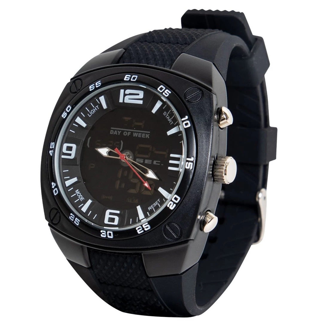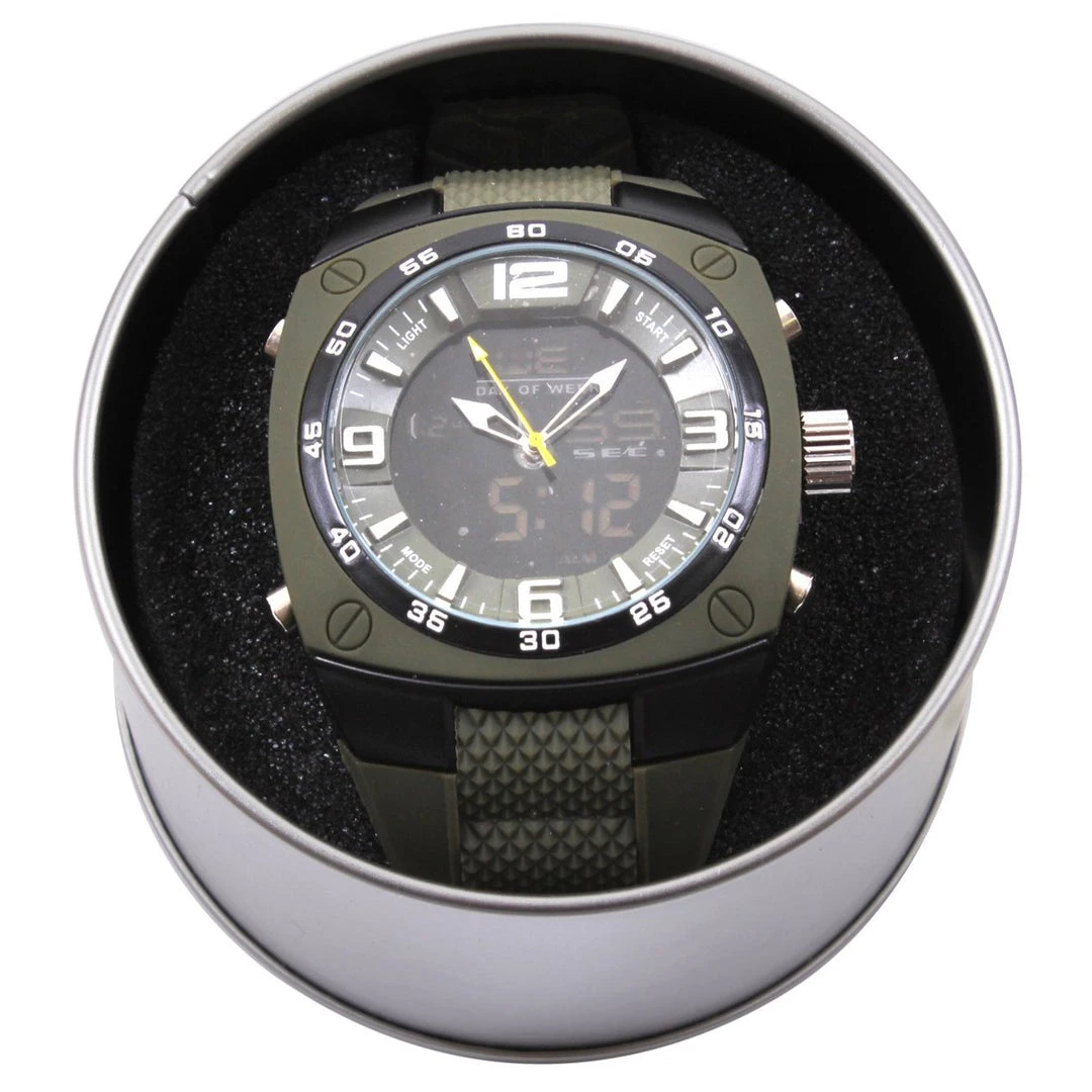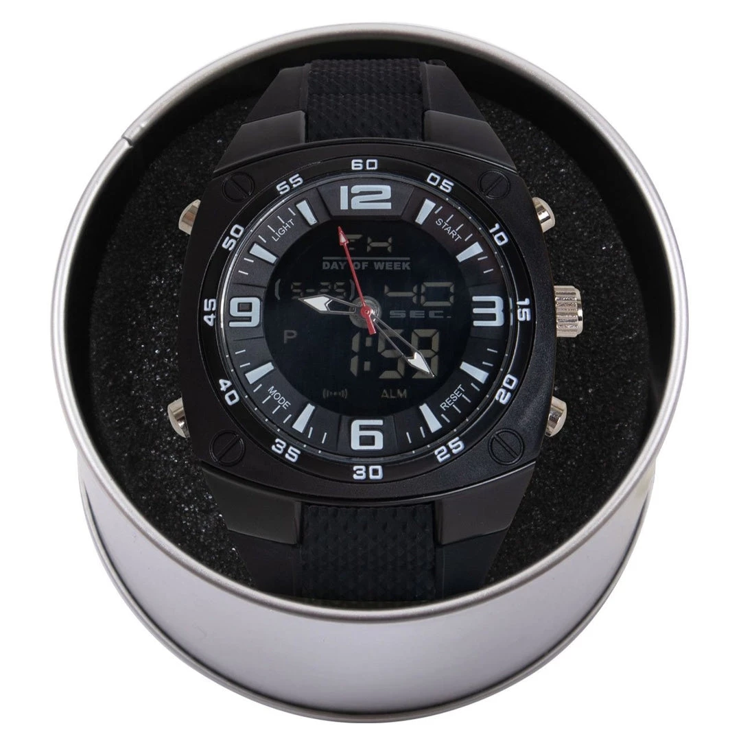 You will always get the time right with Rothco’s XLarge Military Style Analog & Digital Display Watch. This military-style watch features an over-sized face and a large, comfortable wristband. Rothco’s wristwatch displays time in analog and in digital with Japan quartz movement. Additional features include a stopwatch function, alarms, both standard and military time displays, and date display including the day of the week. The watch is water-resistant (1 ATM) making it great for all kinds of outdoor activities. A light-up digit function makes the time display easy to read in the dark and the watch comes in a zinc-alloy case for storage.Â