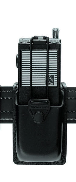 The Model 761 Adjustable Radio Holder is designed with a protective pouch and an adjustable bungee cord tie-down with a snap closure to keep standard portable police radios secure. Constructed of durable SafariLaminate material, this holder is designed for 2.25 in. (58 mm) duty belts.