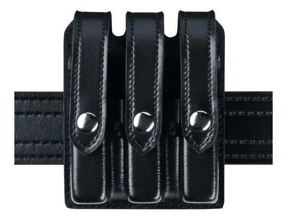 The Model 777 Triple Magazine Pouch is designed to carry three magazines on a 2.25 in. (58 mm) duty belt. The 777 features both vertical and horizontal belt slots, allowing it to ride in either a vertical or low-profile horizontal position. A magazine tension screw located between the pouches allows for easy retention adjustment. It’s constructed of rugged SafariLaminateâ„¢ and is available in several scuff-resistant finishes with four different closures.
