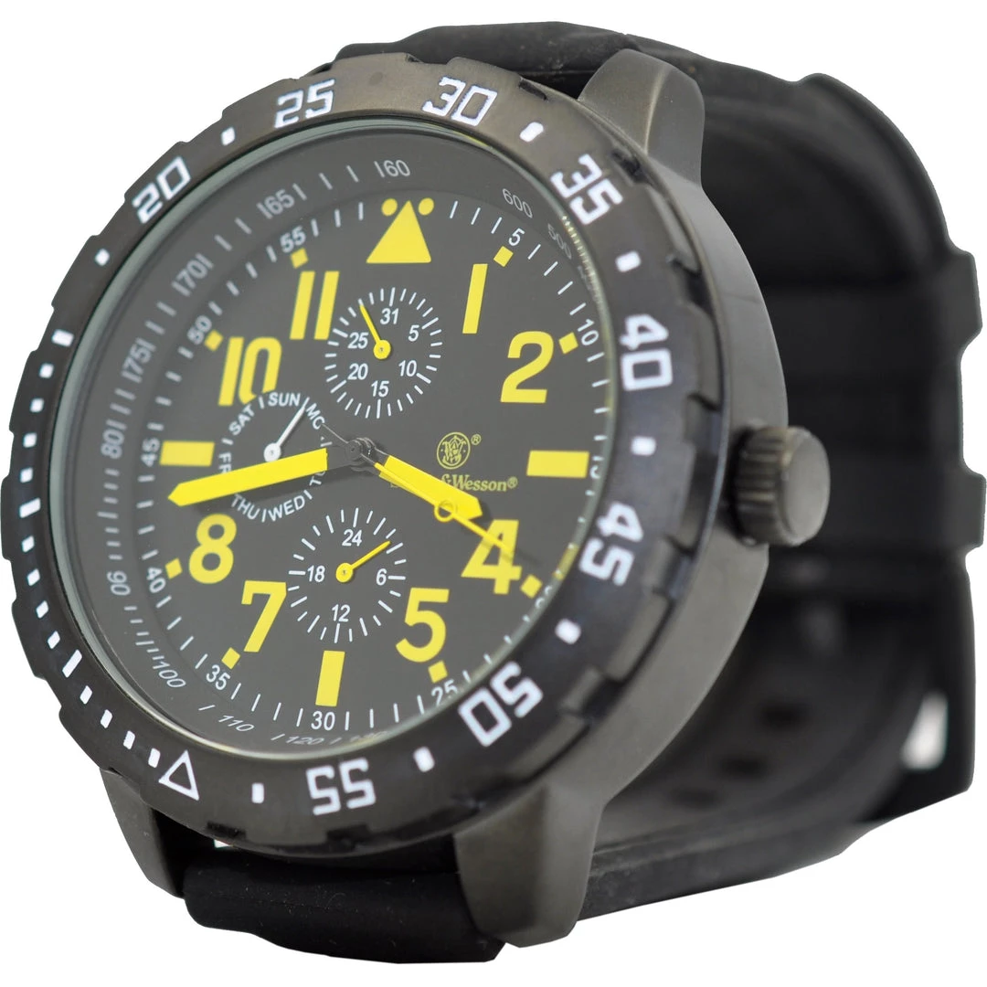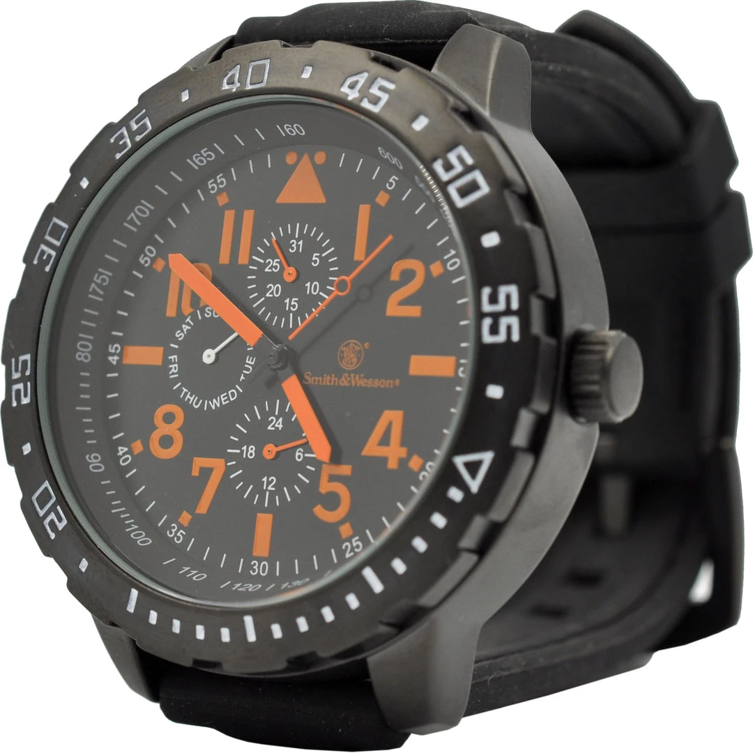 Slide your hand into the bold style and sophistication of the Smith & Wesson Calibrator Watch that features a round black face with large blue numbers and hands and a black rubber wristband with blue stitching. Crafted with all the precision and reliability that’s made Smith & Wesson a staple in the law enforcement community, with a look and feel befitting all your off-the-clock escapades!