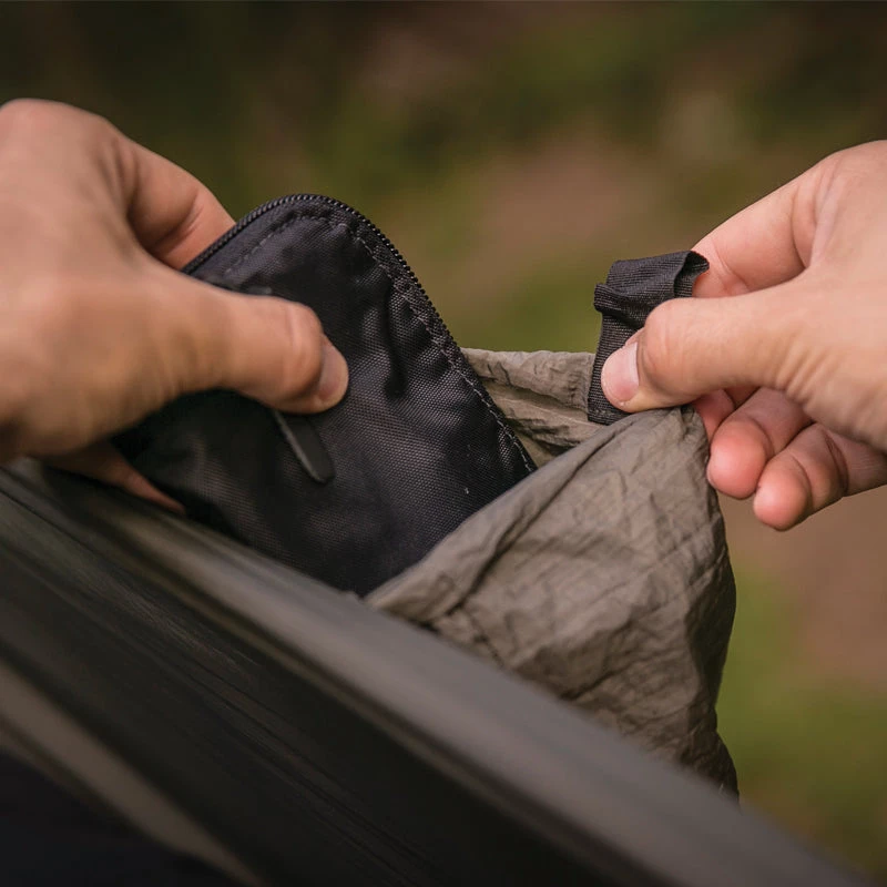 Suspension Attachment System: Made out of 550 paracord with knots spaced to allow for various attachment points and distances from the tree or post to the hammock. No more fumbling and tying knots, nor finding the perfectly spaced tree as the Suspension Attachment System allows for various lengths to attach the hammock as required. Simply wrap the Suspension Attachment System around the desired tree then run the knotted end through the loop end and attach the carabiner on the hammock to the knotted section to achieve the desired length and height when setting up.