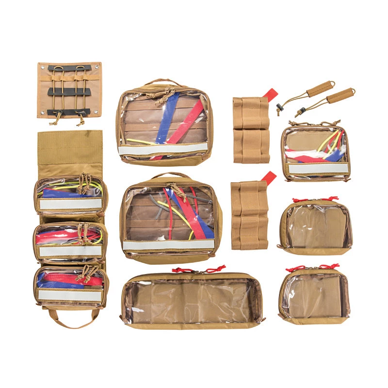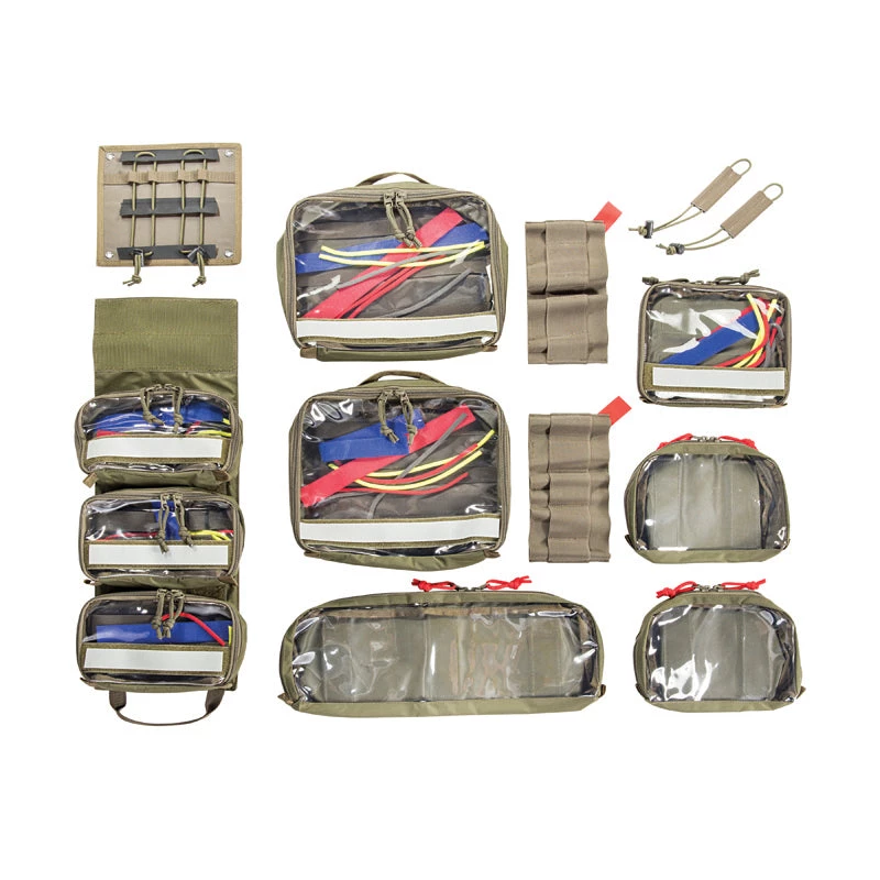 Transparent pouches with hook-and-loop closures that convert a backpack with hook-and-loop interior into a Medic Pack. This set is especially made for the TT Modular Pack 30. Two basic pouches go in the middle and two long and two short pouches go on the sides. A removable divider has smaller pockets on it. The elastic loop set for bandages and accessories can be attached to all of the hook and loop panels. The TT Modular Medic Insert 30 Set is great for outfitting other TT backpacks, but not all of the pieces may not be used.