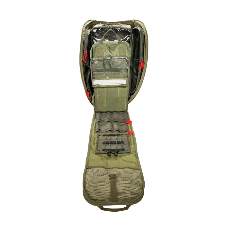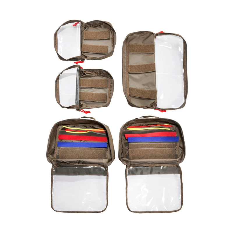 Transparent pouches with hook-and-loop closures that convert a backpack with hook-and-loop interior into a Medic Pack. This set is especially made for the TT Modular Pack 45. Two basic pouches go in the middle and two long and two short pouches go on the sides. A removable divider has smaller pockets on it. The elastic loop set for bandages and accessories can be attached to all of the hook and loop panels. The TT Modular Medic Insert 45 Set is great for outfitting other TT backpacks, but not all of the pieces may not be used.
