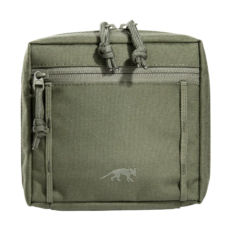 Accessory pouch with a large opening and the MOLLE reverse system. The inside features a MOLLE hook-and-loop, a mesh pocket, and elastic loops.