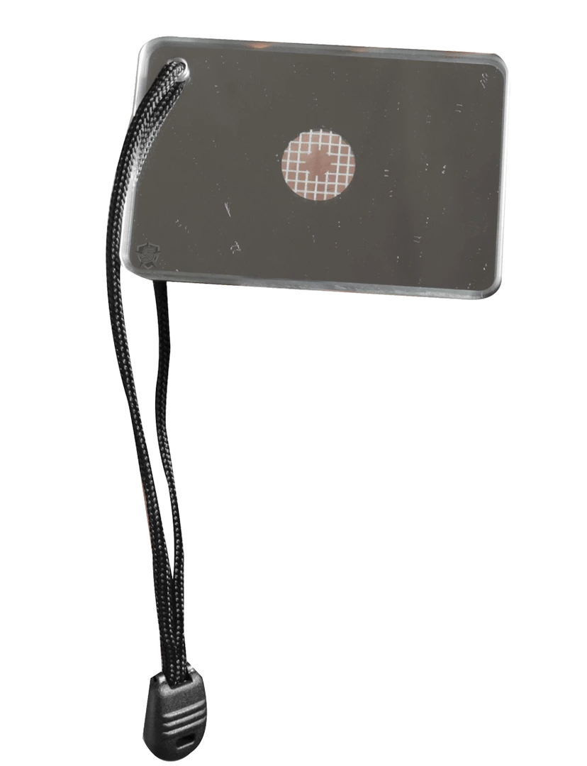 - Sighting hole with reflective screen that reflects sunlight for miles