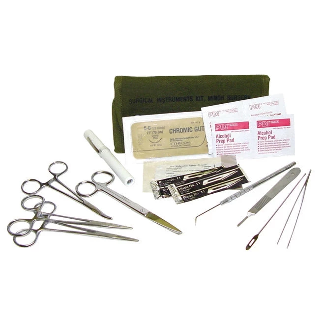 - Contents Include: 2-Straight & 1-Curved Hemostats, 1-Pair Scissors, 1-Pair Tweezers, 1-#3 Scalpel Handle, 2-Scalpel Blades, 2-Suture Sets, 1-Holder, 1-Needle Probe, 2-Alcohol Wipes, 2-BZK/Iodine Wipes & 1-Pen Light