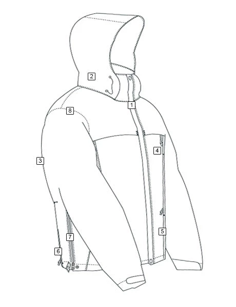 - Detachable, rollable and stowable hood with wrap around chin guard, flexible wire brim and hood volume adjustment