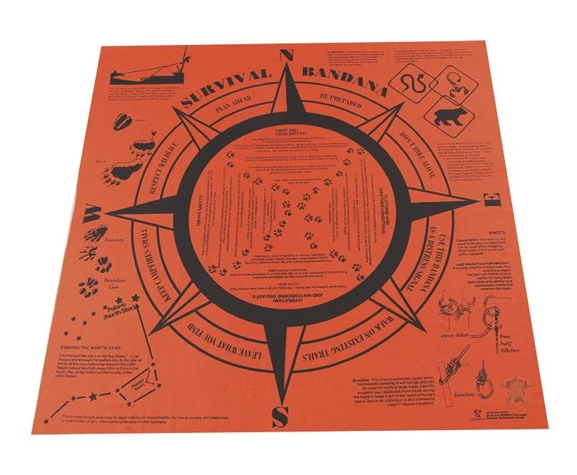The 5ive Star Gear® Survival Handkerchief/Bandana provides basic survival information including setting up a campsite, finding the North Star, some basic knots, hiking safety, first Aid, food safety, clothing and weather conditions, hydration and waterborne diseases, animal tracks, bear safety, snake and scorpion bites. This is an essential item for any hiking or camping trip that is a large size and bright orange color making it perfect to carry in case you need to signal for aid, and the information printed on it may just help you in a wide variety of emergency situations.