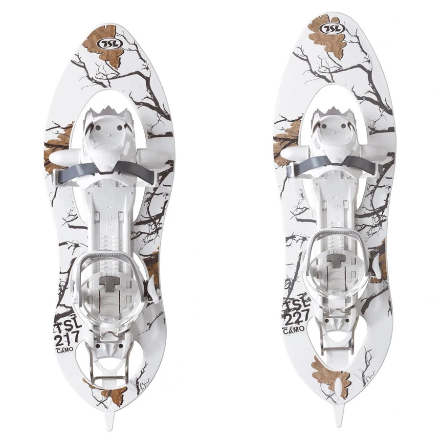 Snowshoes 217 & 227 CAMO: With their increased flotation, the 217 and 227 CAMO are very popular in powder snow. Technically sophisticated and offering great traction, they are simple and comfortable to use. Size is easily memorized. Heel block tightening via the instep strap is secure and reliable. For lovers of wide-open spaces.