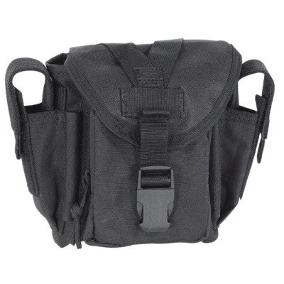 The Voodoo Tactical Dump Pouch attaches to your universal vest, platform or range bag. Perfect for stashing extra mags. 2 side covered adjustable pistol mag pouches, inner full sized compartment with drawstring extended collar, outside zippered front pouch for loose rounds, more mags etc. 2 front pencil/pen slots. Full flap cover with fixed side-release buckle.