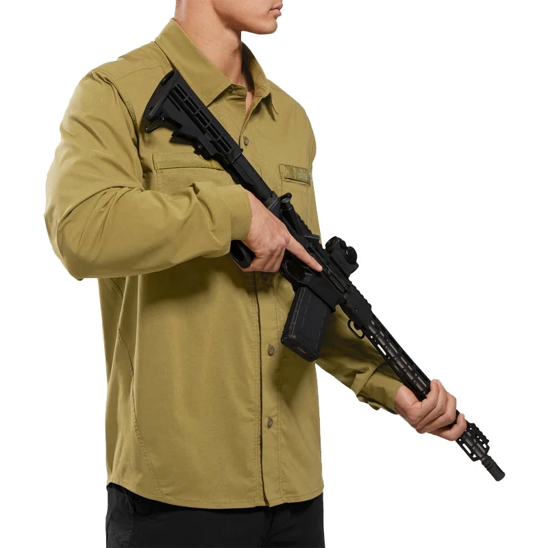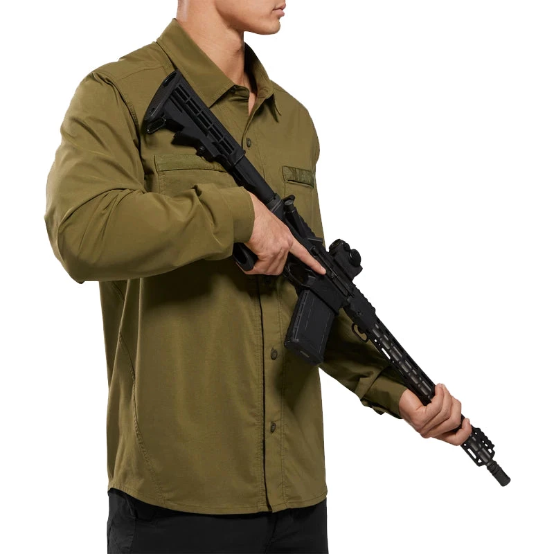 Whether you need protection from the harsh sun, or the office requires you to hide your anti-social ink, the Sofari long ops shirt has you and your arms covered. The CombatGrade blended stretch fabric with diagonal side seam translates into a greater range of motion, laser perforated underarms for venting, and zippered chest pockets for EDC security. Office approved, range ready, professional always.