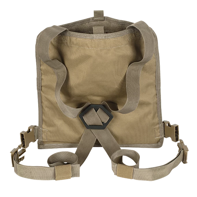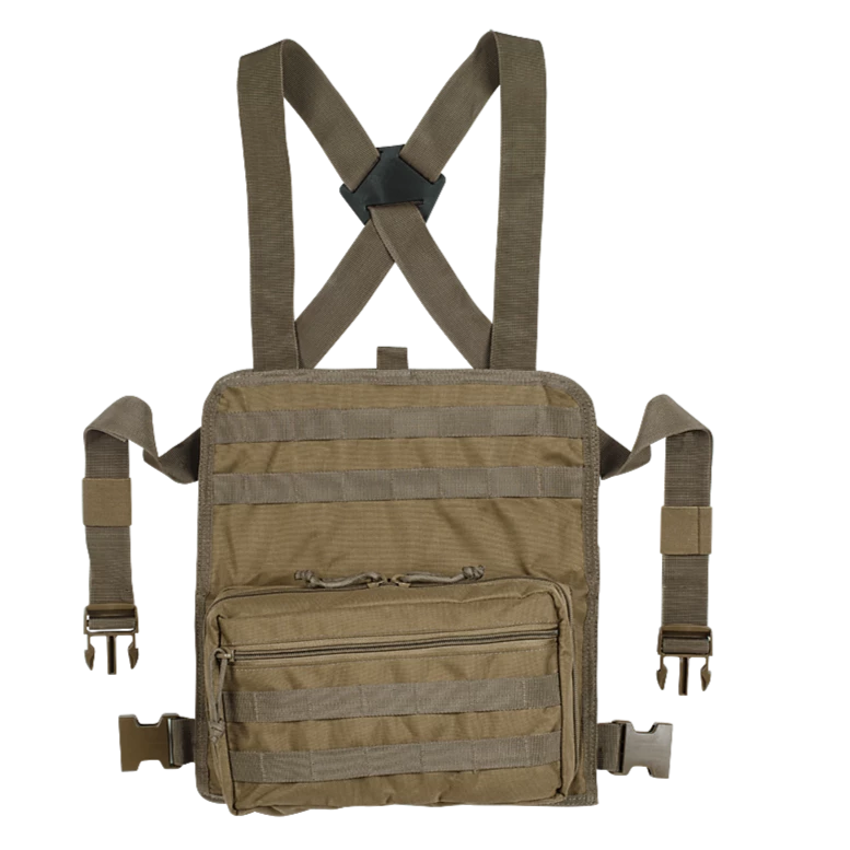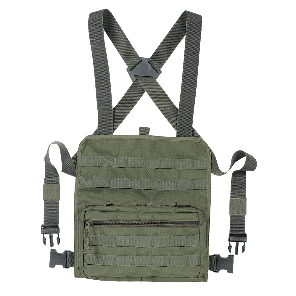 A versatile chest rig with adjustable shoulder harness and chest belt. Chest rig is covered in PALS webbing for additional pouches. The front pouch unzips to totally expose the interior that has 2 attached zippered soft mesh pockets. There is a horizontal zipper on the front of this pouch for added personal gear. The hook-n-loop full-size top pocket is great for map and document storage. The rig allows for hands-free performance while carrying your tactical gear.