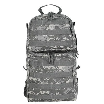 An enhanced hydration pack with padded foam comfort back and padded shoulder straps. Seven rows of universal straps on the 2 rear compartments. Right or left side hose exits with elastic straps on shoulder pads. Deluxe bladder included with color matched neoprene hose cover included.