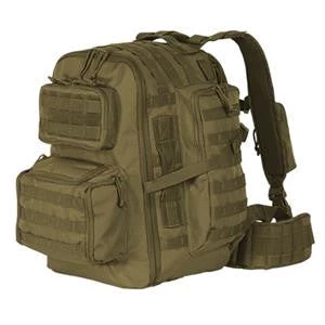 Padded, adjustable, removable shoulder straps have MOLLE webbing and attached zipper pouches for cell phone, flashlight, knife, compass or other small gear. Pack features a fully lined interior, side compression straps, padded, adjustable, removable waist belt with MOLLE webbing, interior hydration compartment with right and left covered hose exit ports, three drag/carry handles (one on top and one on each side), side zippered and padded protective compartment for laptop or iPad, inside front flap has sewn-in admin pockets to secure office gear.
