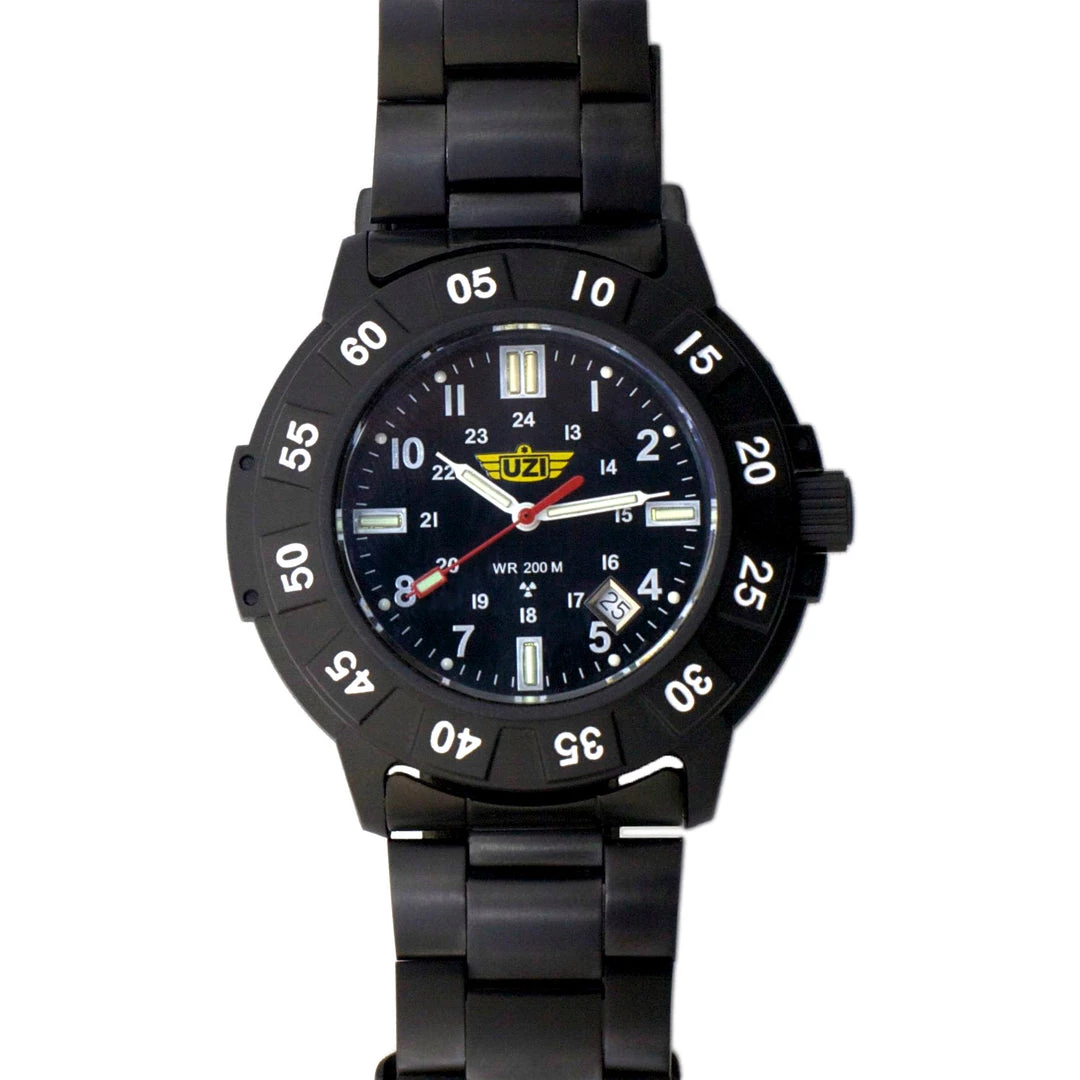 This watch includes a black metal band and has a black dial with white numbers and measures 43-mm in diameter. The UZI-001-M Protector Swiss Tritium Watch comes with a 1-year limited warranty that protects against defects in material and workmanship.