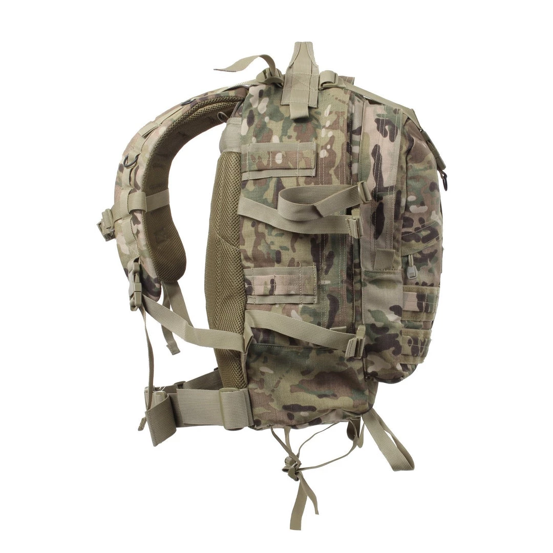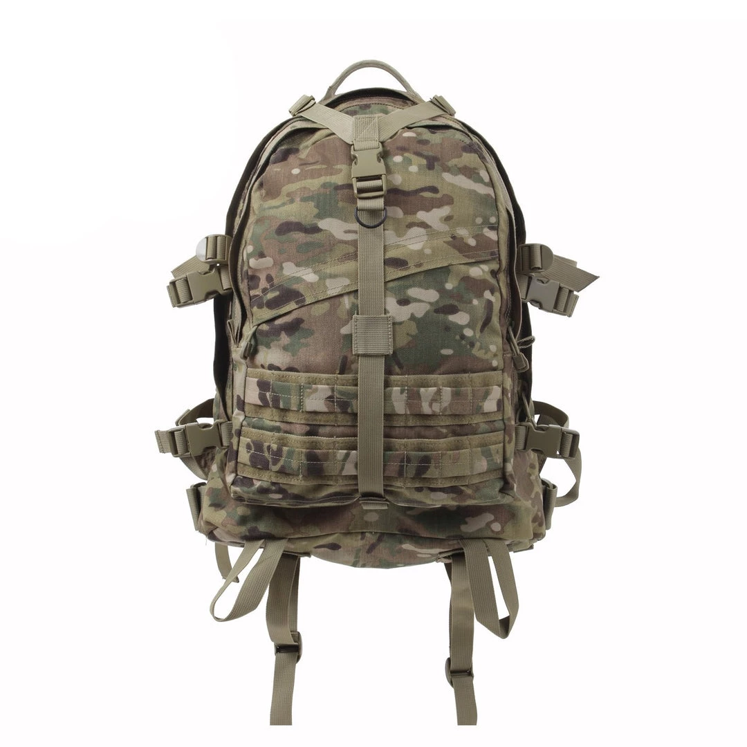 Designed to fit all your military and tactical needs, Rothco’s Large Camouflage Transport pack features extensive storage options and is made with a heavyweight polyester material (Multicam Is Made With 1000D Cordura Nylon Fabric), the interior has also been treated with a water repellant coating. The camo tactical pack measures approximately 19″ X 15″ X 8″ and features two large compartments, plus a zippered front compartment that is ideal for organizing your gear or loading out a Bug Out Bag. Given the extensive storage options, the tactical pack has been designed to ensure comfort for long hauls. Rothco’s tactical backpack features adjustable padded shoulder straps with D-rings, a padded mesh back and adjustable and a removable waist belt which aides in weight distribution and pack stabilization. In addition, the military pack features a top and side adjustable web straps and a top carry handle. Rothco’s Large Transport Pack is also MOLLE and hydration compatible.Â