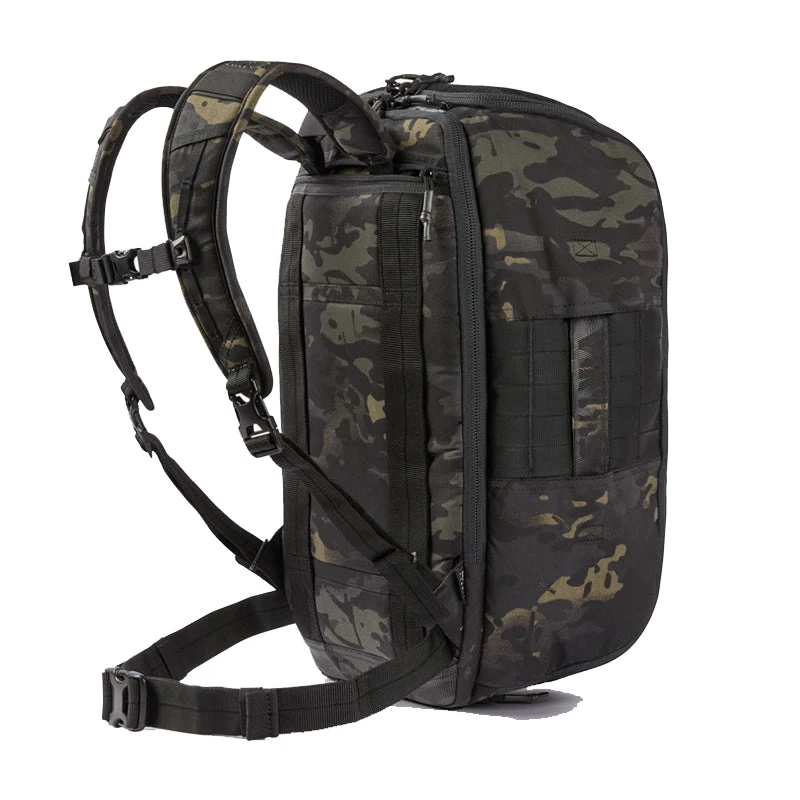 A hydration bladder pocket accepts up to a 3-Liter bladder, complete with hose access port and routing. Padded backpack shoulder straps are stowable to keep the bag completely clean of snag hazards. Dual webbing straps on the back of the Kadre allow it to be placed onto the handle of most wheeled luggage. Whether your range is a five-star VIP bunker or a primitive flat-site, the Kadre will ruck all your essentials. Overall dimensions 21″ H x 13″ W x 9” D.